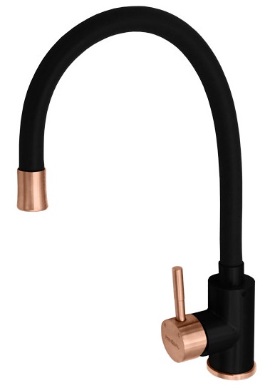 Насадка аэратора, рычаг управления и постамент основания смесителя выполнен в декоре «Розовое золото». Черное матовое окрашенное покрытие по нержавеющей стали (цвет запекается при высоких температурах, поэтому не стирается, не выгорает на солнце и не меняет окраску при включении горячей воды) отлично сочетается с медным сатинированием!
