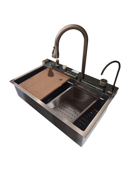 На рабочей панели уместилось 4 источника подачи воды из внутреннего накопителя с управлением клавишами «фортепианного» типа — смеситель, 70-струйная «вуаль», плоский поток-вспениватель и ополаскиватель стаканов, здесь же дозатор мыла Cherry и кран Cool для фильтрованной воды. Смеситель Flagman с выдвижной лейкой тоже многофункционален, работает в 3 режимах благодаря многоразъемному аэратору.