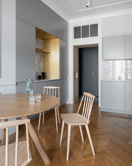 Повторить такой интерьер поможет профиль Jerky из линейки Gola Contemp® for Kitchen без анодирования: профиль устанавливается в верхний торцевой паз всех фасадов нижней базы и окрашивается вместе с полотном фасада в единый цвет. Форма профиля позволяет легко открывать как распашные фасады (под столешницей), так и выдвижные фасады ящиков.