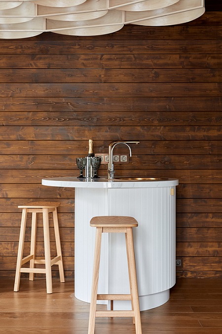 А ведь решение очень простое — комбинированный смеситель с двумя кранами и двумя изолированными изливами для воды от водопровода и от фильтра в одном корпусе. Например, Лорен 8201 из линейки смесителей из «пищевой» нержавейки Botanica в декоре «Pink Gold», который к тому же почти полностью повторяет форму основного смесителя в проекте дизайнера