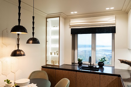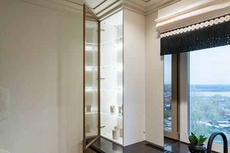 Здесь оптимальным решением была бы витрина с системой Gola Contemp® Con Bisagras всего с 2 скрытыми петлями Vuelta, которые размещаются в крышке и дне корпуса, а потому не видны сквозь прозрачное стекло и не мешают размещению большего числа полок внутри. Петли выдержат высоту фасада до 2200 мм! Сам фасад из профилей Toro и Manto в «Латунь браш» — полностью повторил бы дизайн оригинального.