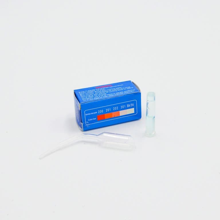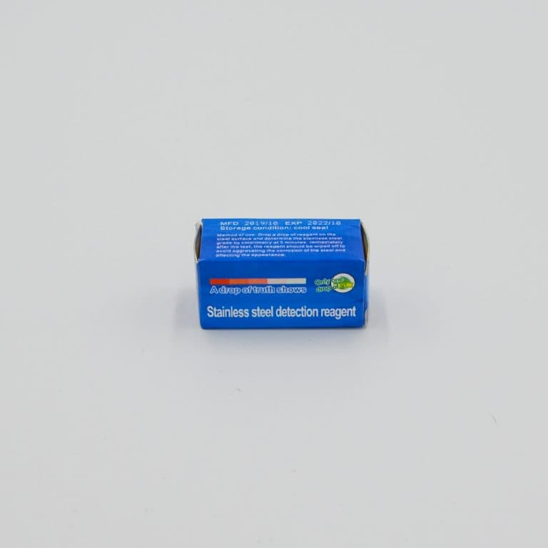 Суть теста: капля индикатора, нанесенная на поверхность нержавеющей стали, вступает в реакцию с составом нержавейки и окрашивается. В зависимости от оттенка капли можно определить марку стали. Для этого на боковой стороне картонной коробочки нанесена специальная шкала колоризации индикатора.