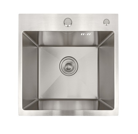 Размер квадратной чаши 400х400 мм, глубина мойки 220 мм, т.е. очень эргономичная, продуманная форма и размер — как раз для высоких смесителей, устанавливаемых в непосредственной близости от мойки.