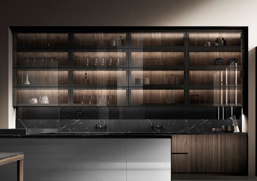Чтобы показать лицом всю коллекцию посуды, на кухне фудблогера 2022 обязательно должна быть витрина. Буфет в новом прочтении легко создать с помощью рамочного фасадного профиля и красивого стекла.