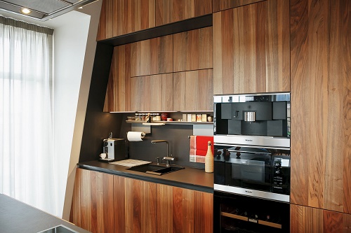 Кухня без ручек не лишена декоративности — за эстетику отвечает специальный профиль, установленный на кухонные шкафы позади фасадов. Это не только удобно, но и просто в установке. Фасады не повреждены отверстиями под мебельную ручку и расположены в одной плоскости. В профиль также можно установить светодиодную ленту для многоярусной подсветки.
