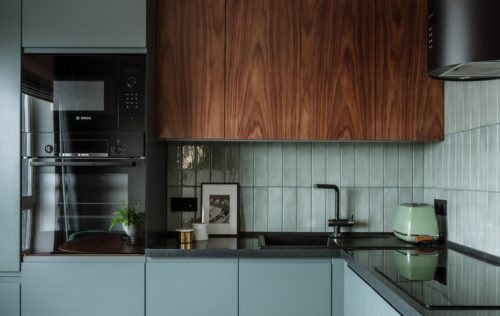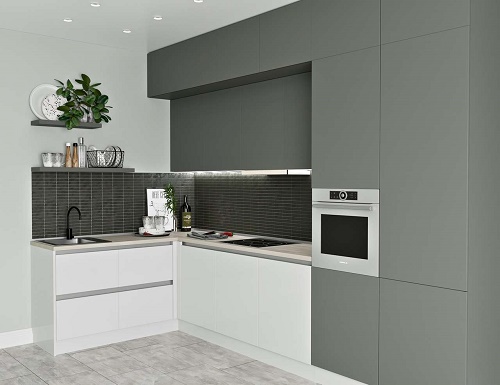 Один из самых популярных материалов для кухонных фасадов — матовые пластики и эмали — диктуют условия по внешнему виду кухонного гарнитура. Наиболее выигрышно матовые пастельные и приглушенные цвета смотрятся на кухнях в три яруса с монолитным расположением фасадов. Лаконичный стиль и отсутствие лишних деталей — визуального шума — позволяют воспринимать даже большие кухни как легкие и простые решения. Ключевой фактор — кухня лишена лицевой фурнитуры.