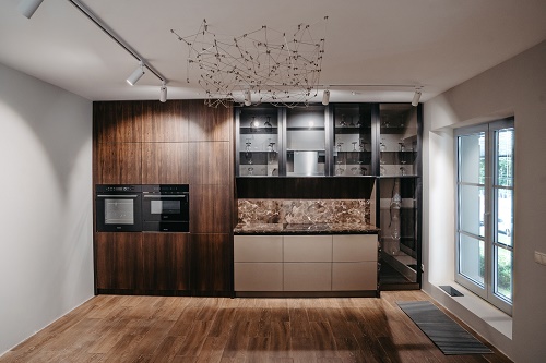 Минимализм, витрины на кухне, отсутствие ручек и графичные цвета