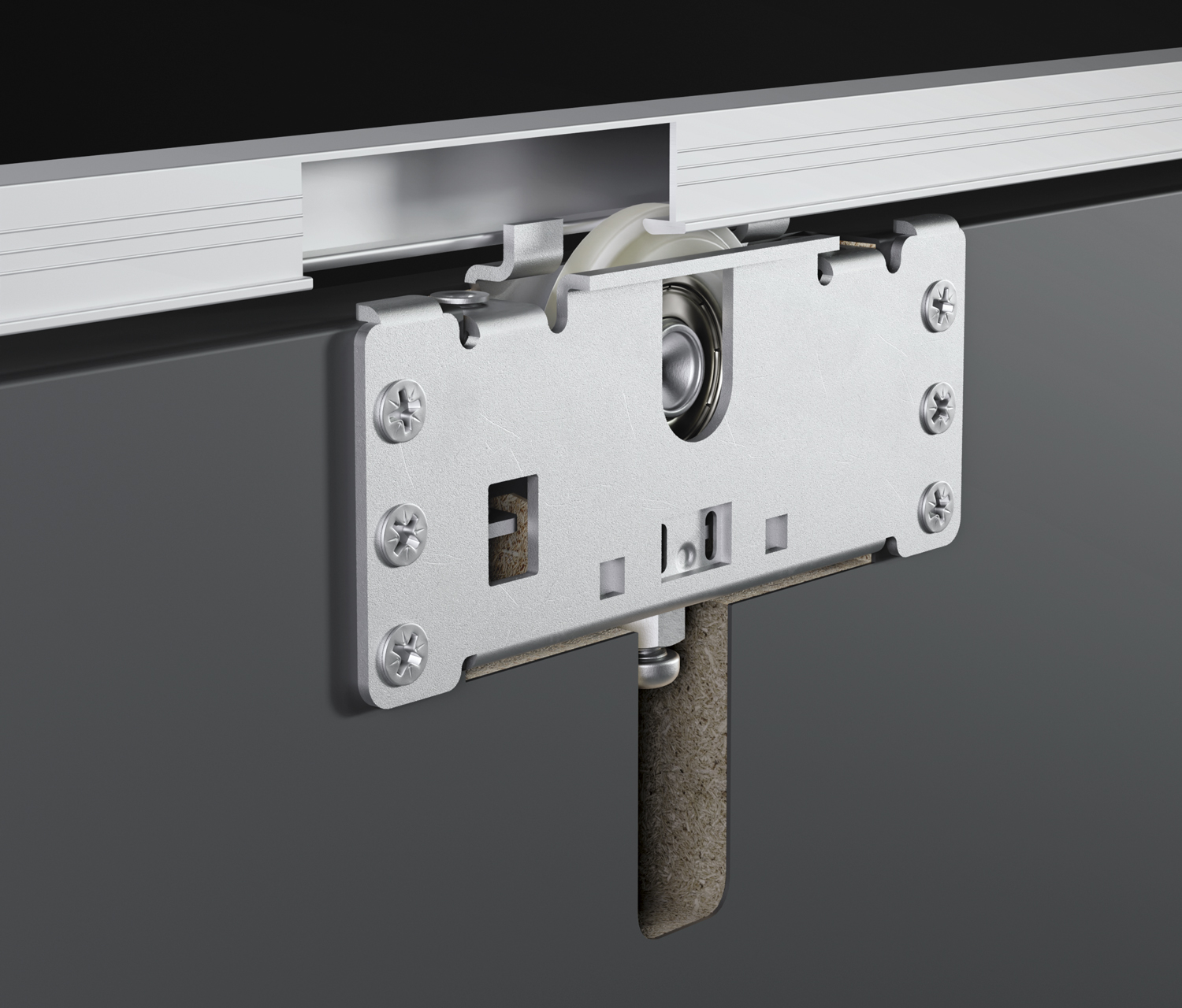 Движение дверей происходит на универсальных роликах с покрытием из POM-термопласта в стальном корпусе. Такая комбинация материалов обеспечивает тихий, плавный ход и повышенную износостойкость: заявленный срок службы роликов – до 50 000 циклов открывания/закрывания.
