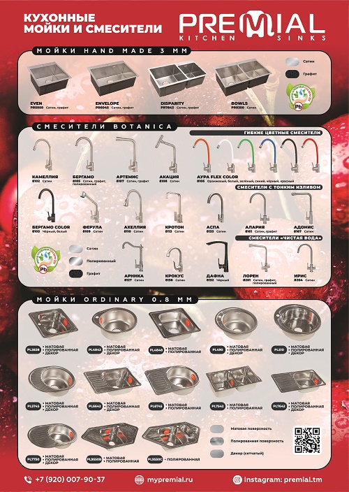 Большой и яркий промо-плакат формата А2 (42*59 см) с полноцветной глянцевой печатью содержит весь ассортимент кухонных моек и смесителей Premial® из нержавеющей стали.