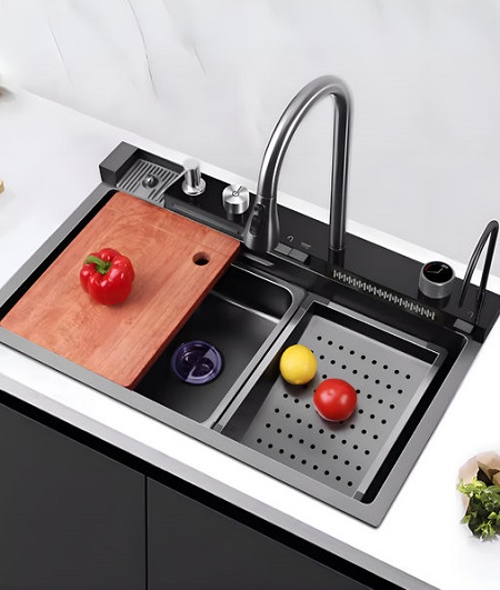 Мойка оснащена цифровым дисплеем для контроля температуры и режима смесителя, а также подсветкой для комфорта при работе.