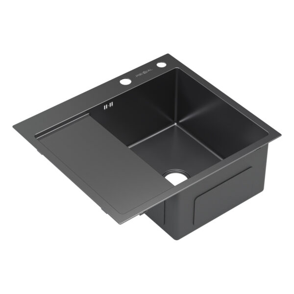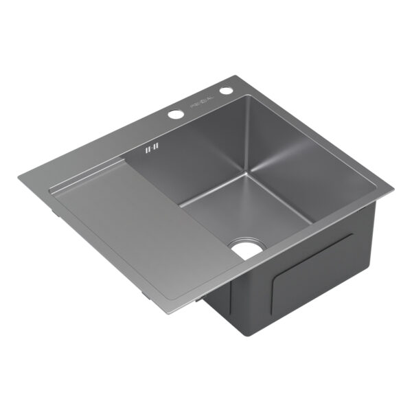 Мойка полностью ручной работы, дно сварное, в форме «конверта», корпус обливают шумопоглощающим составом серого цвета. В надкрылке одно отверстие под смеситель и одно отверстие под дозатор/кран для питьевой воды. В качестве аксессуара к мойке идет телескопическая корзина-коландер Kit из стального прутка на пластиковых держателях.