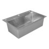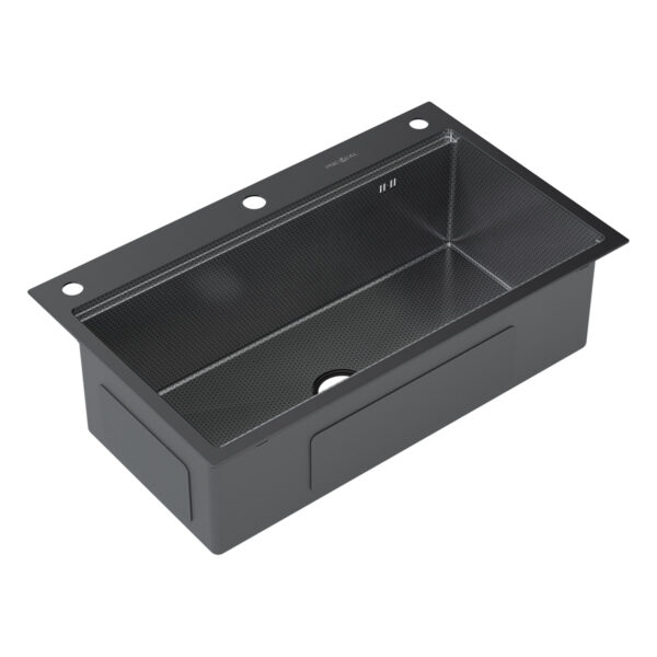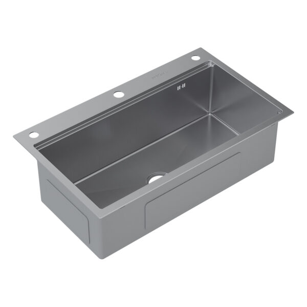 Мойка из пищевой нержавеющей стали 3 мм, габаритные размеры 750х450 мм, выполнена вручную. Размер чаши 700х350 мм. Дно сварное «конвертом», корпус в шумопоглощающей обливке серого цвета из натуральных пигментов и нейтральных полимеров. Сделано одно отверстие под смеситель и два отверстия под дозатор/кран питьевой воды. Аксессуары к мойке: дозатор для жидких моющих средств Cherry и дуршлаг-корзина Crate. У мойки комфортная глубина 220 мм, снижающая разбрызгивание воды, малый радиус скругления углов чаши — для большей вместимости.
