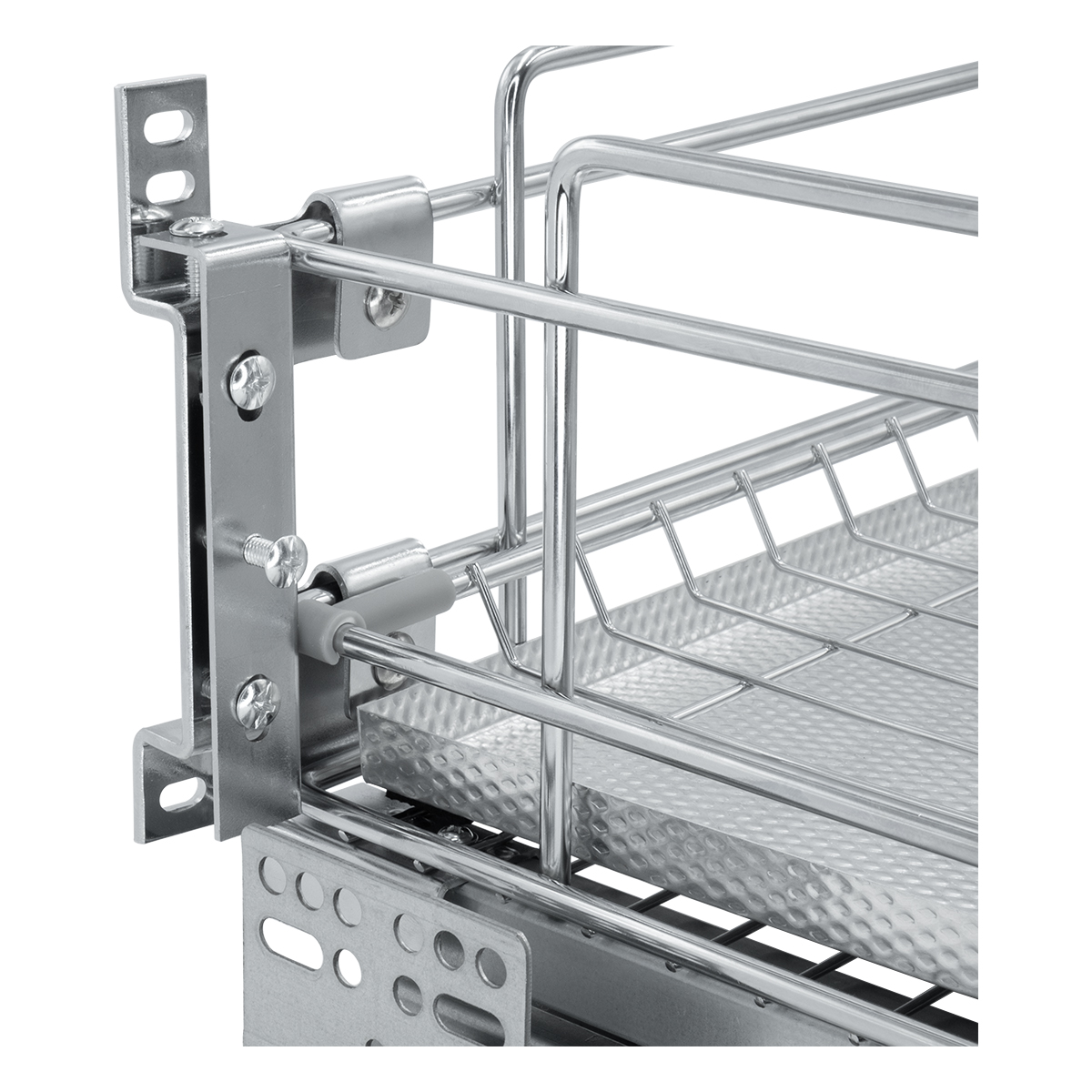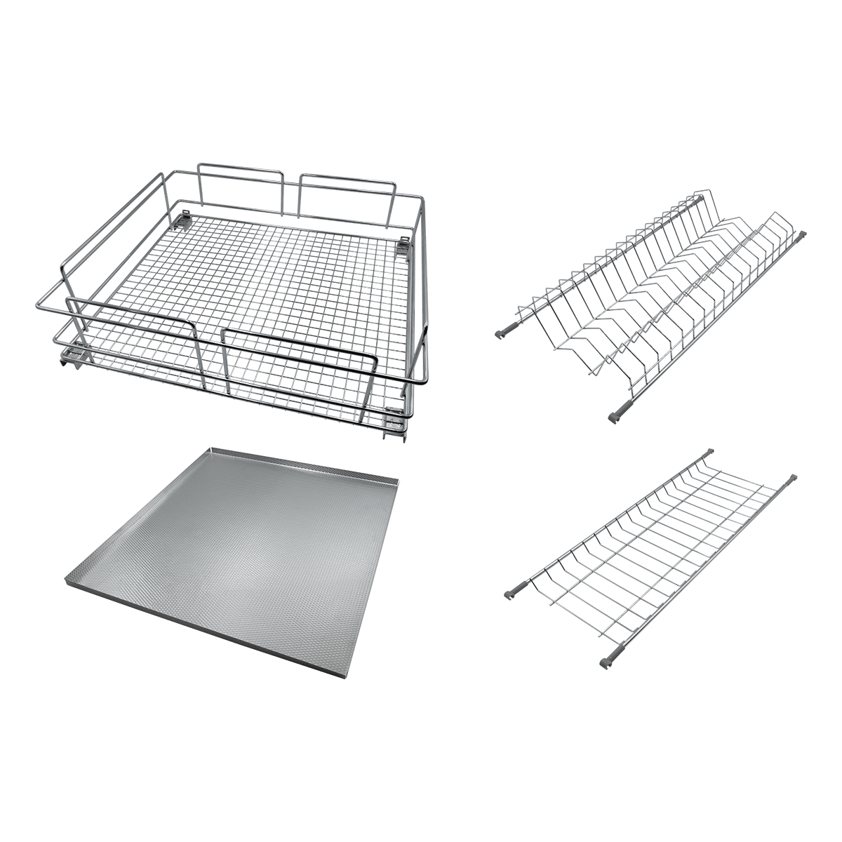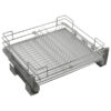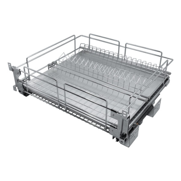 Посудосушитель выдвижной с доводчиком в нижнюю базу, выполнен с гальваническим хромированием прутка и комплектуется прочным алюминиевым поддоном.