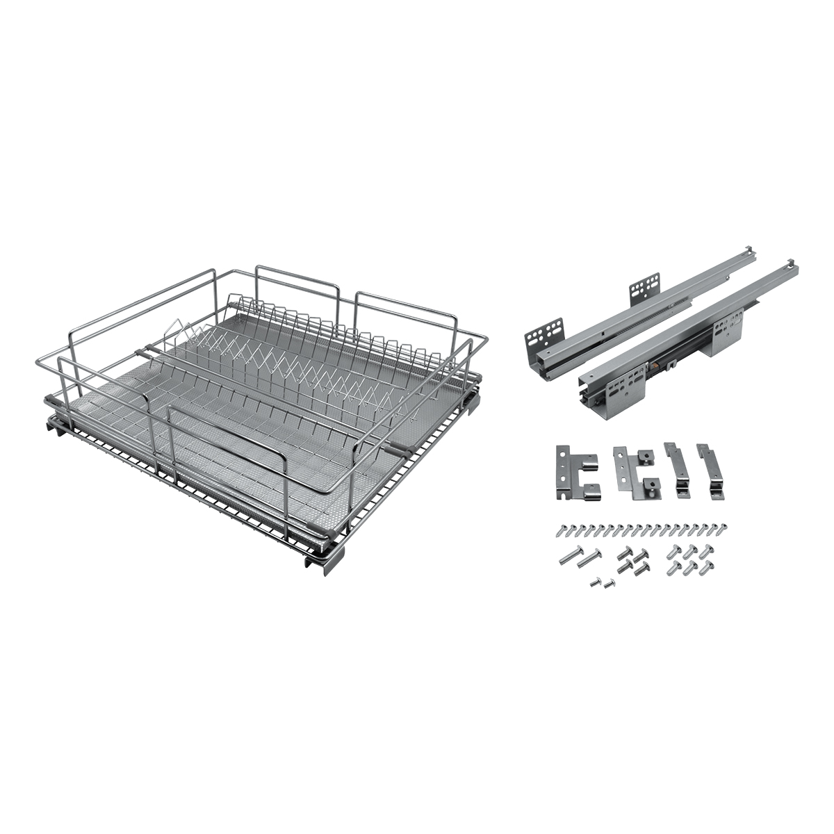 Посудосушитель Largo выполнен на направляющих скрытого монтажа с полным выдвижением, оснащен доводчиком на закрывание и фасадным креплением.