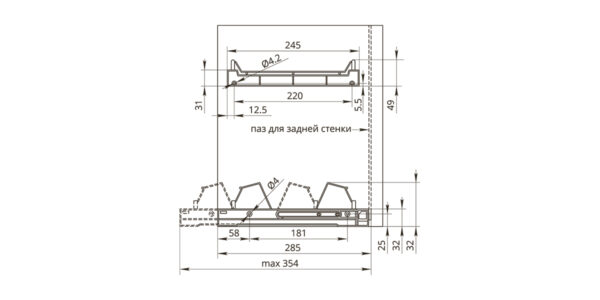 Регулируемая глубина установки от 284 мм до 354 мм позволит использовать посудосушитель с фасадами без ручек (в т.ч. с открыванием от нажатия). Паз под заднюю стенку облегчит установку.
