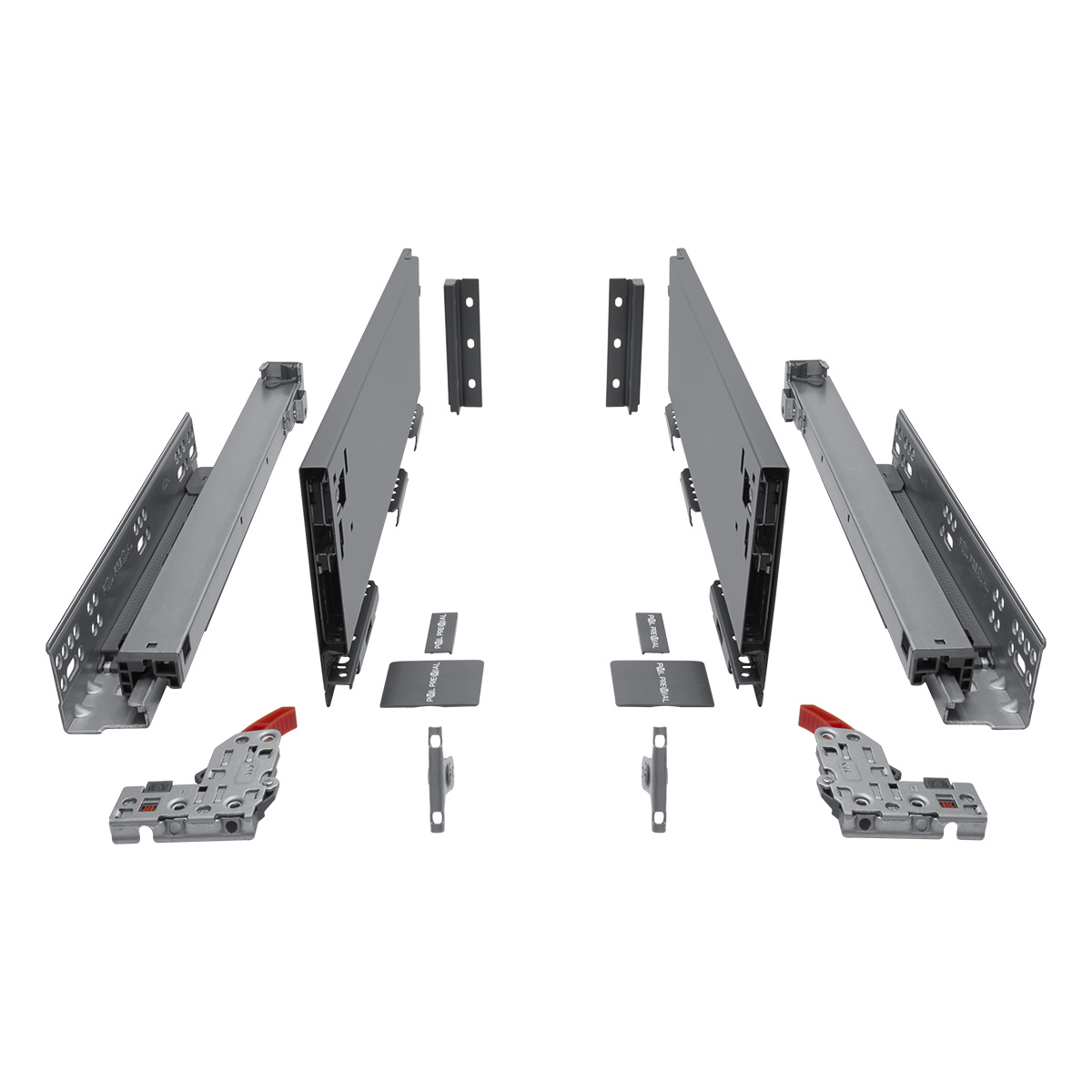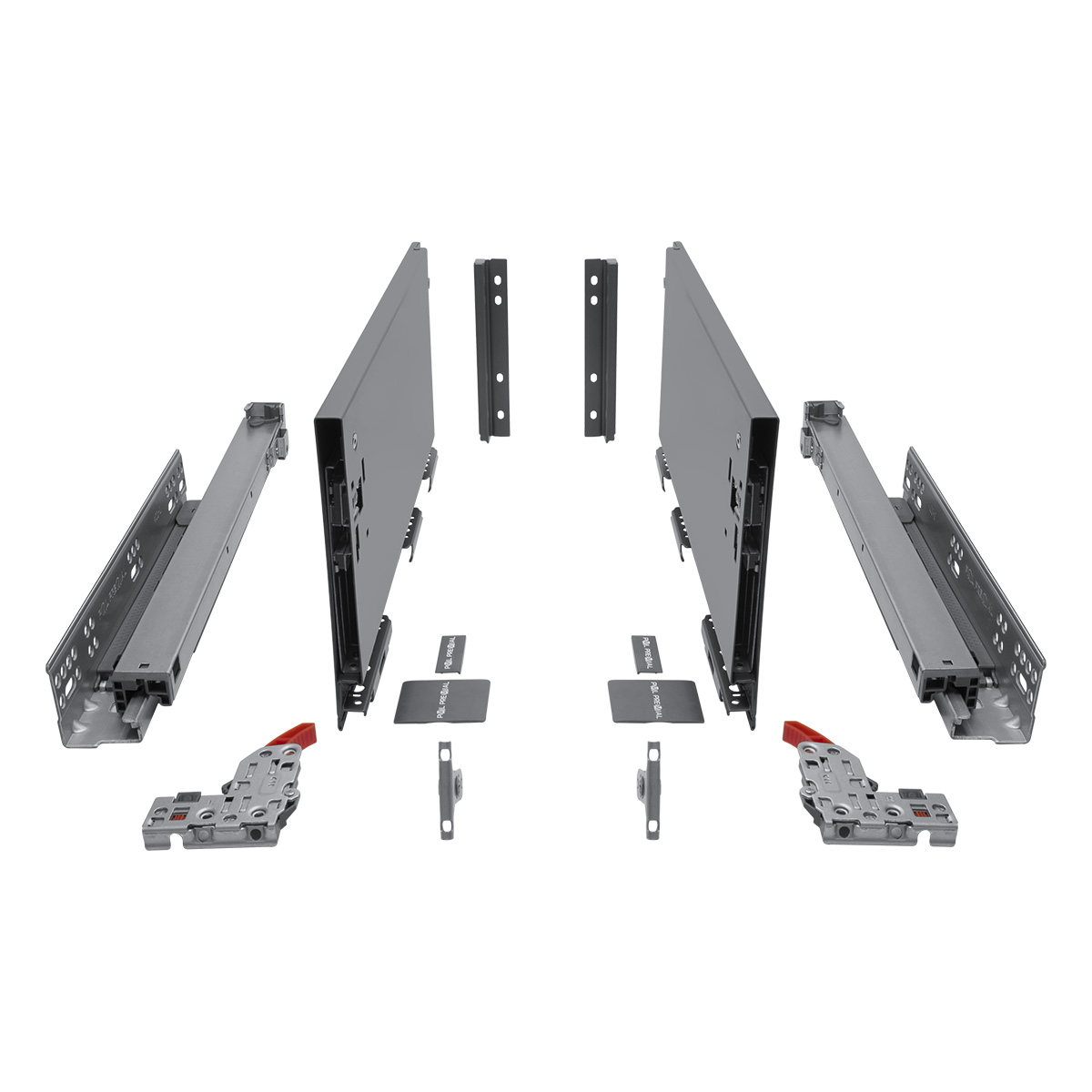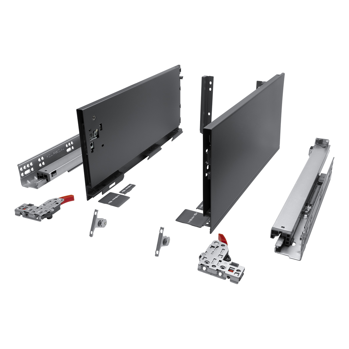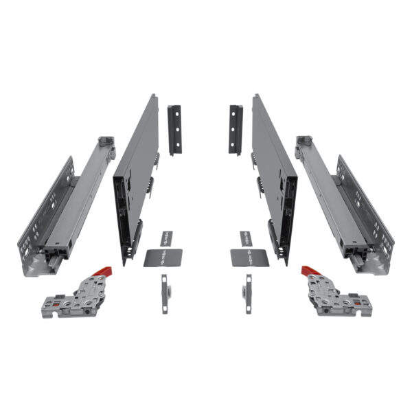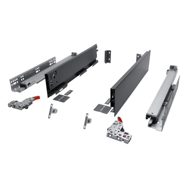 Комплектность: Направляющая скрытого монтажа (L+R); боковина ящика с декоративными накладками (L+R); фиксаторы (L+R); фиксаторы фасада, 2 шт; крепления задней стенки (L+R)