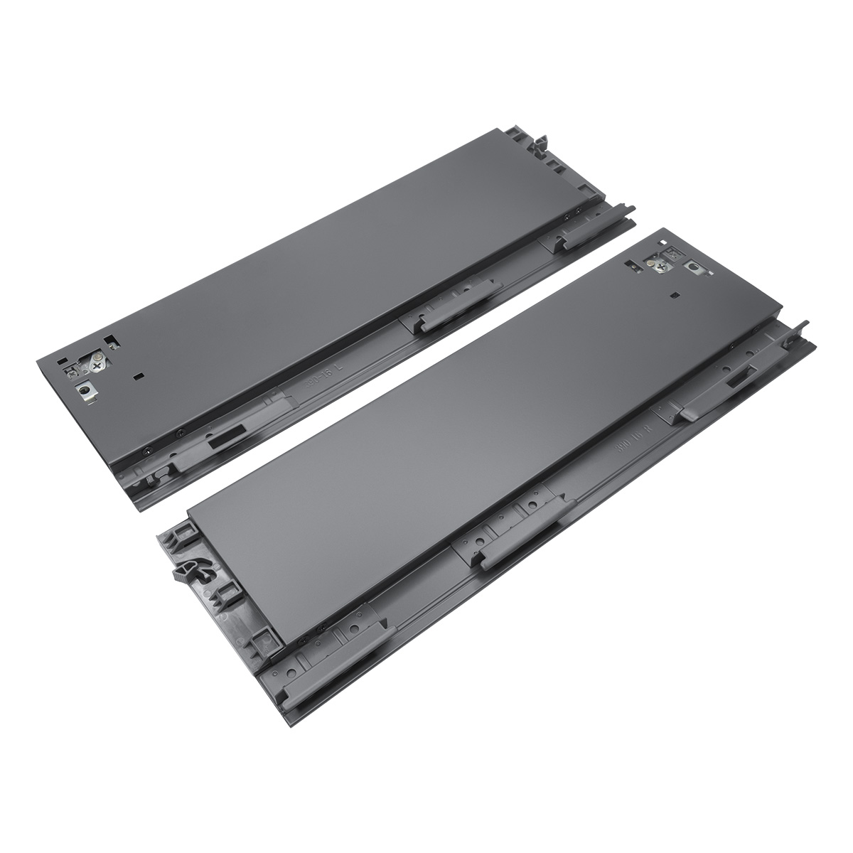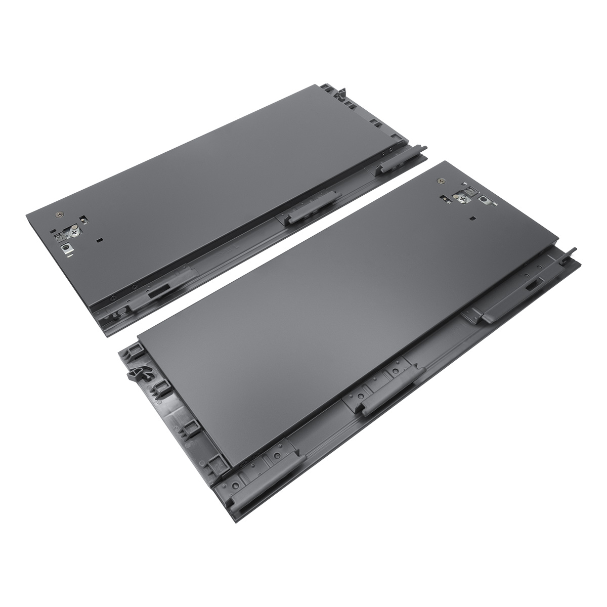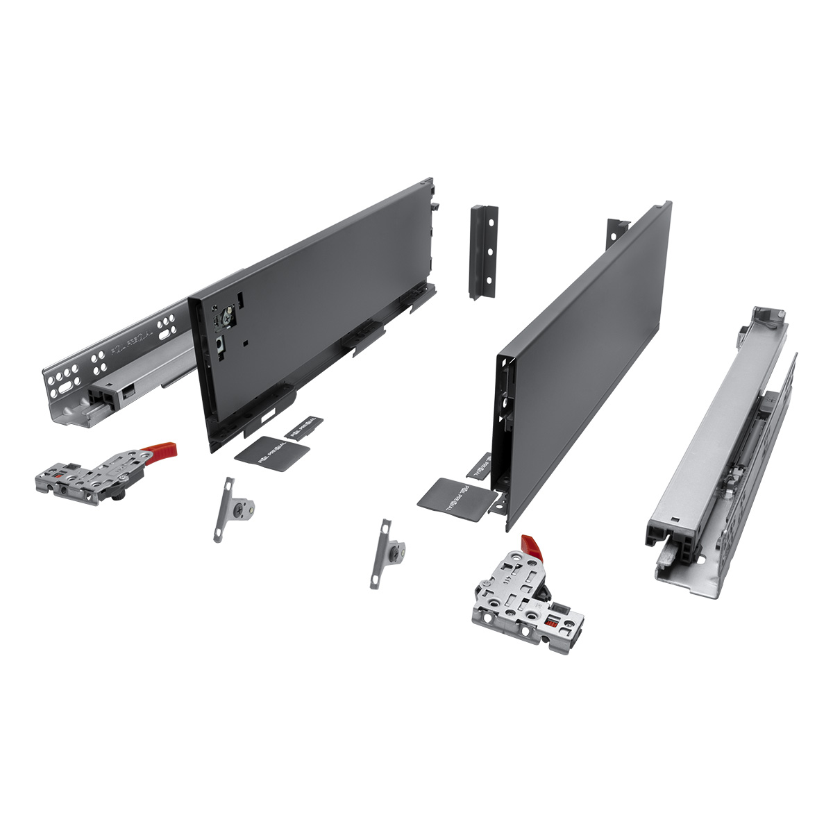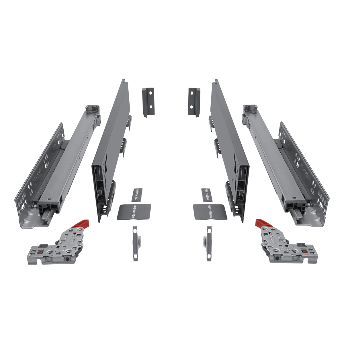 Комплектность: Направляющая скрытого монтажа (L+R); боковина ящика с декоративными накладками (L+R); фиксаторы (L+R); фиксаторы фасада, 2 шт; крепления задней стенки (L+R)